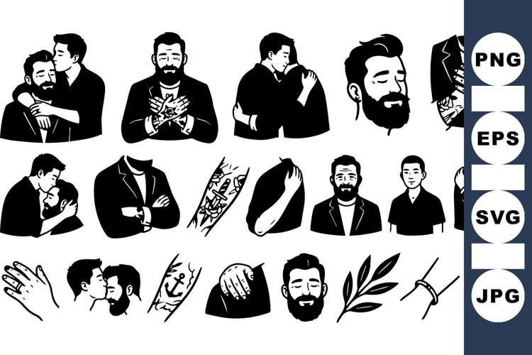 A tattoo flash inspired icon sheet presents bearded man and male couples in affectionate poses for stickers, editorial, and branding, intimate.