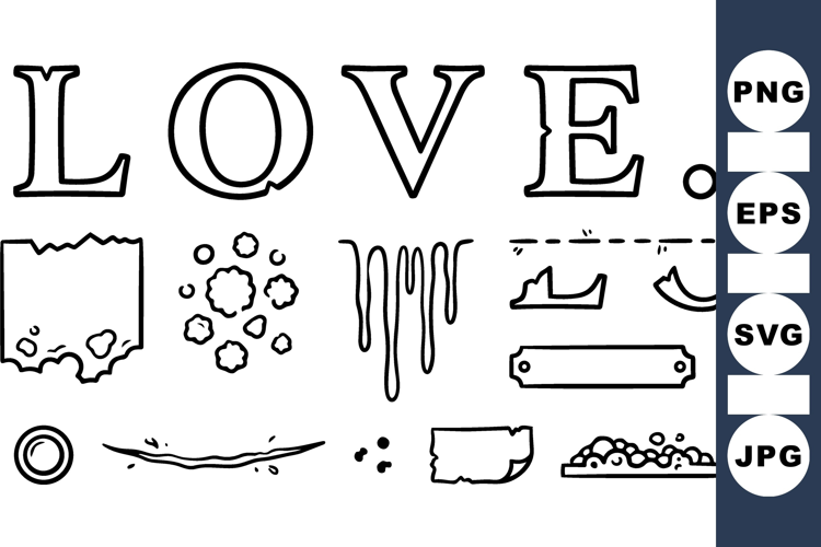 A hand drawn line art sheet displays love letters and assorted texture doodles for stickers, branding, and illustrative accents, playful.