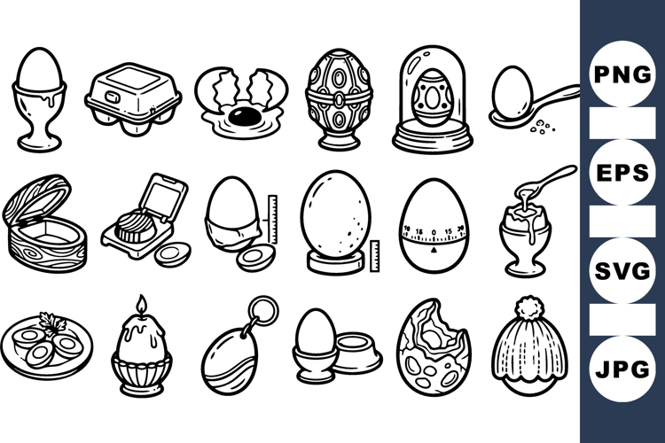 A playful line art icon set depicts varied egg designs for easter decorations and craft projects, suited to stickers and print, cheerful.