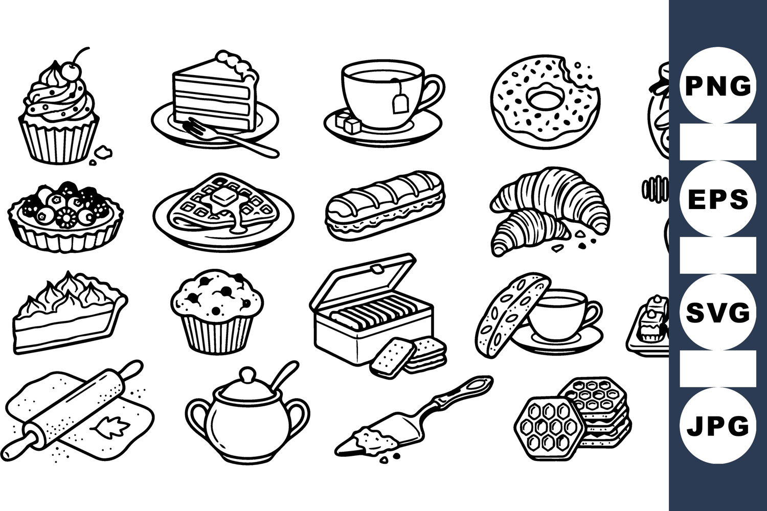 A hand drawn line art collection depicts pastries, tea, waffles and honey, useful for packaging, menus, and culinary branding, charming.