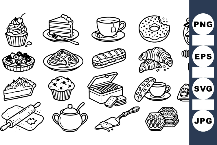 Tea Time Illustration Vintage Bakery Clipart Baking Design Bundle Hand Drawn Desserts Pastry Illustration Set Black And White Bakery Cookie And Cake Clipart Breakfast Treats Design Sweet Dessert Graphics Lineart Bakery Collection