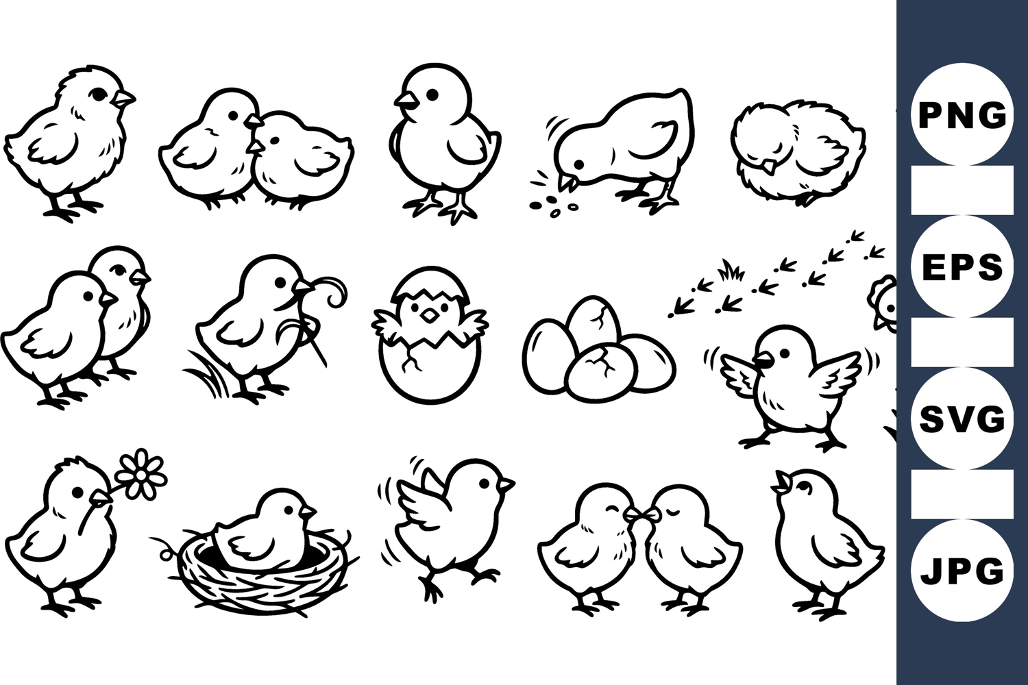 Playful line art illustration of chick icons in multiple poses, used for stickers, coloring pages, educational materials, whimsical.