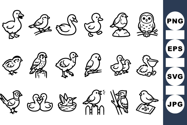 A line art icon sheet shows assorted bird drawings and simple black strokes for web, print, and educational labels, playful.