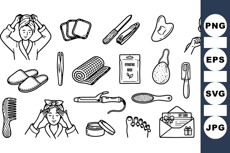 Self Care Illustrations Cosmetic Product Clipart Spa Beauty Clipart Skincare Line Art Black Art Bundle Facial Mask Clipart Hair Styling Set Massage Tool Graphics Wellness Gift Card Relaxation Spa Icons