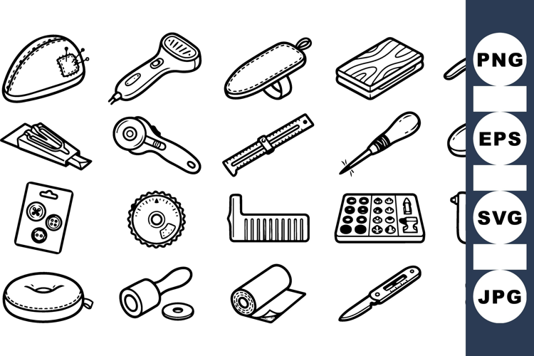 Hand drawn line art depicts sewing tools and notions, suggested for branding, web graphics, patterns, and craft tutorials, clean.