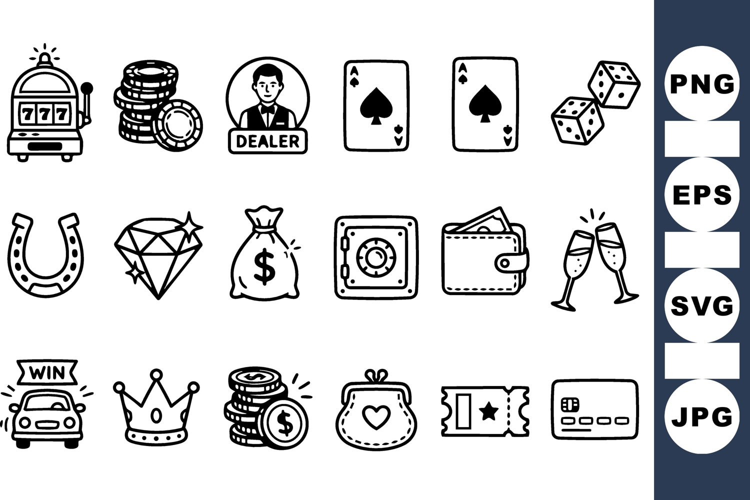 A hand drawn line icon set displays casino and gambling symbols for branding, web icons, and print layouts, playful.