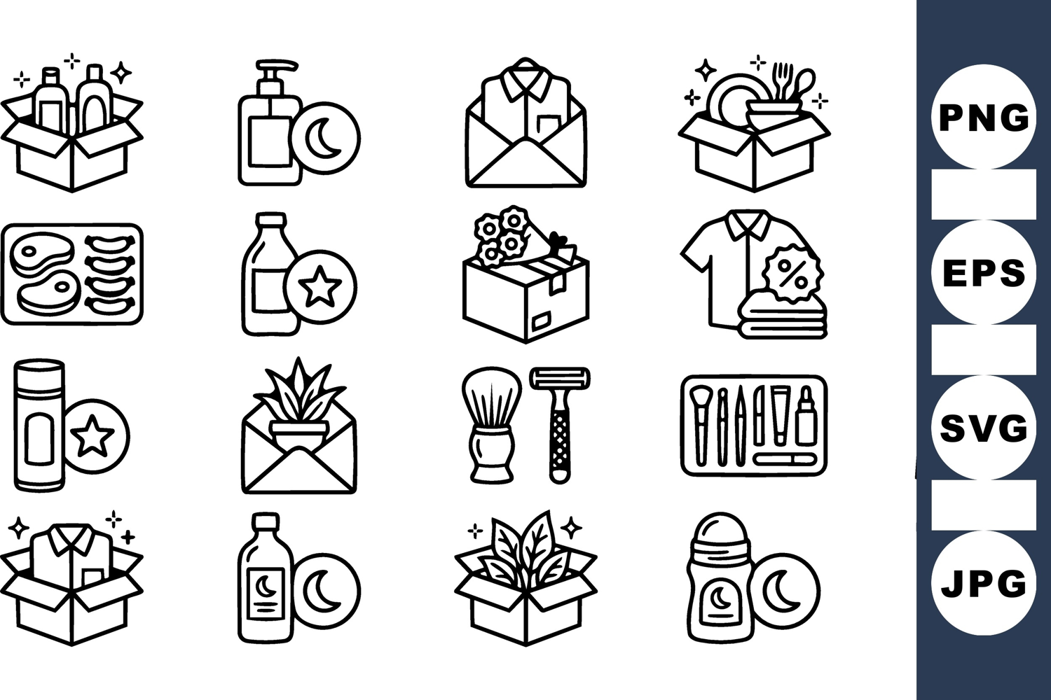 A clean line icon collection depicts subscription boxes, toiletries, cosmetics and shaving tools for app, web, or packaging use; minimal.