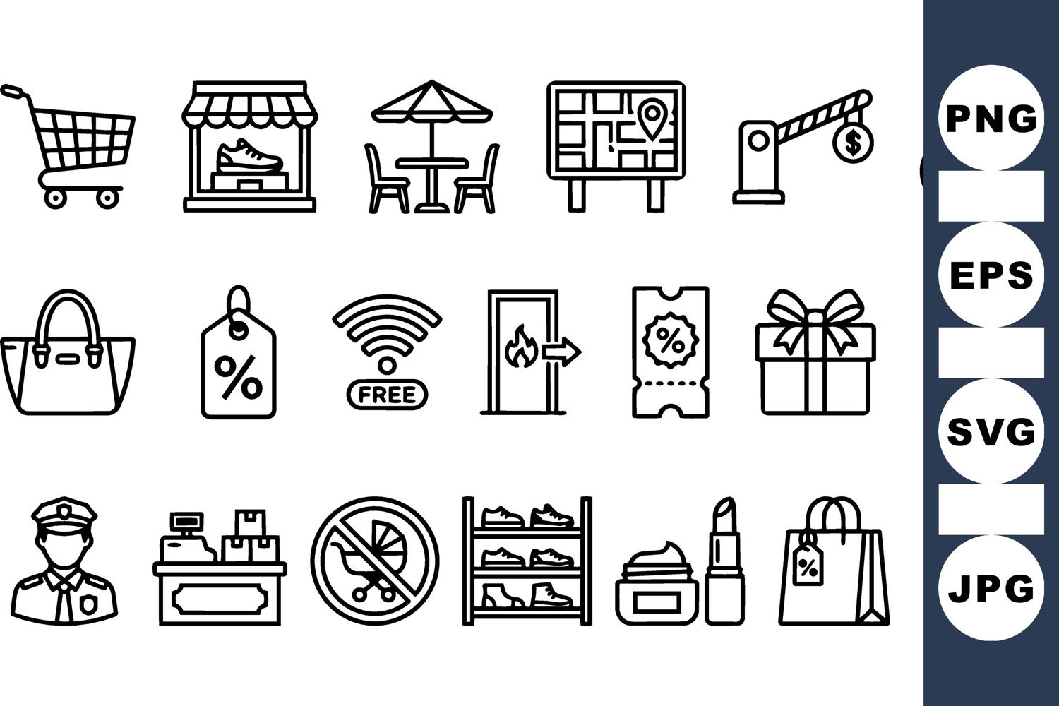A clean outline icon set presents retail and shopping symbols in flat line art for web, app, and editorial use, minimal.