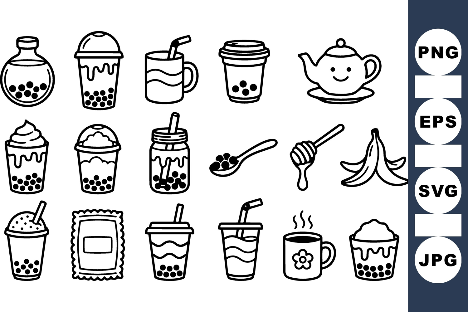 Hand drawn line icons depict assorted bubble tea cups, jars, teapot, honey and banana, presented as a flat icon set, playful.