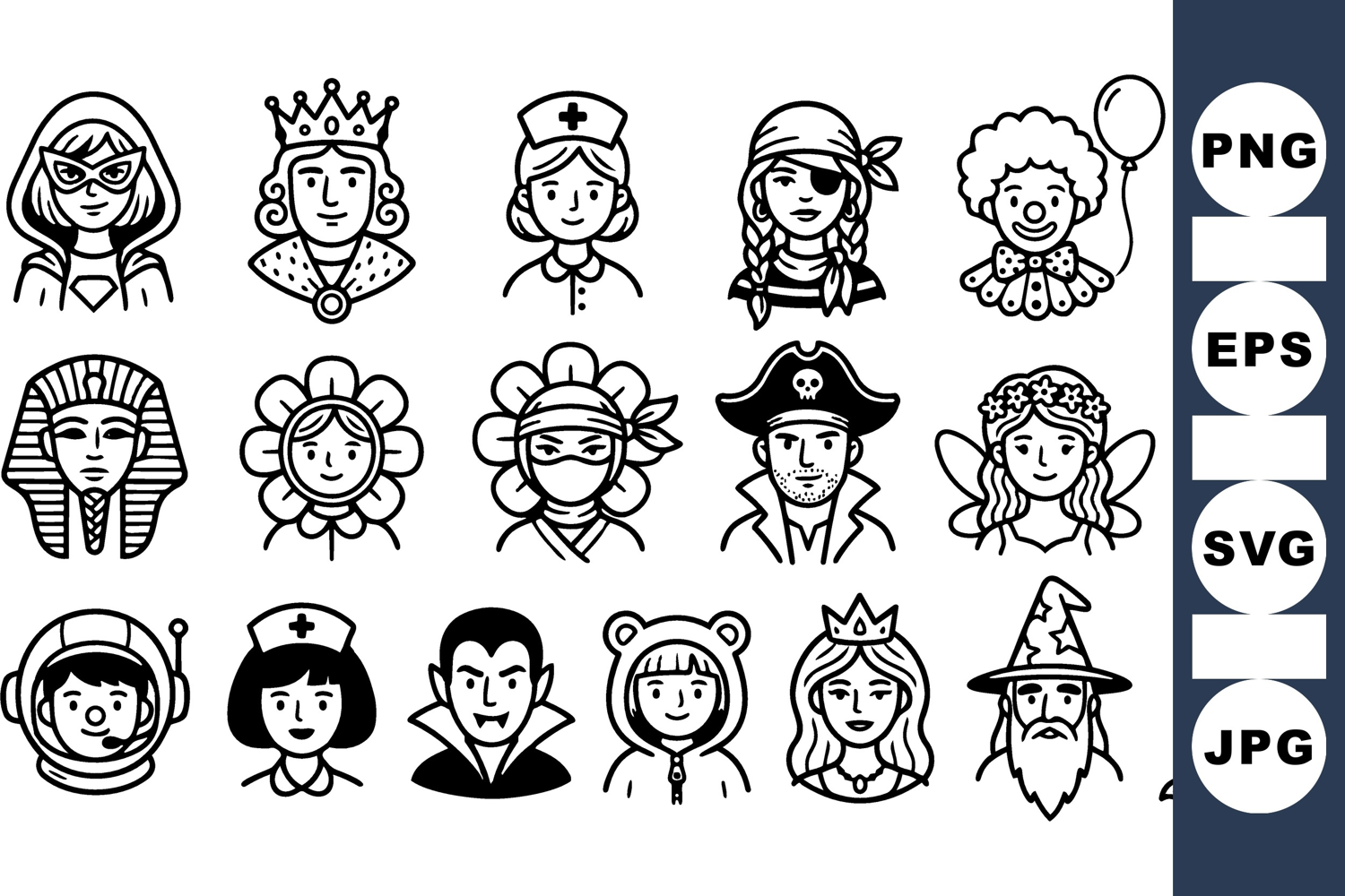 A line art avatar icon set displays varied costume characters for app, web, and editorial use, whimsical and playful.