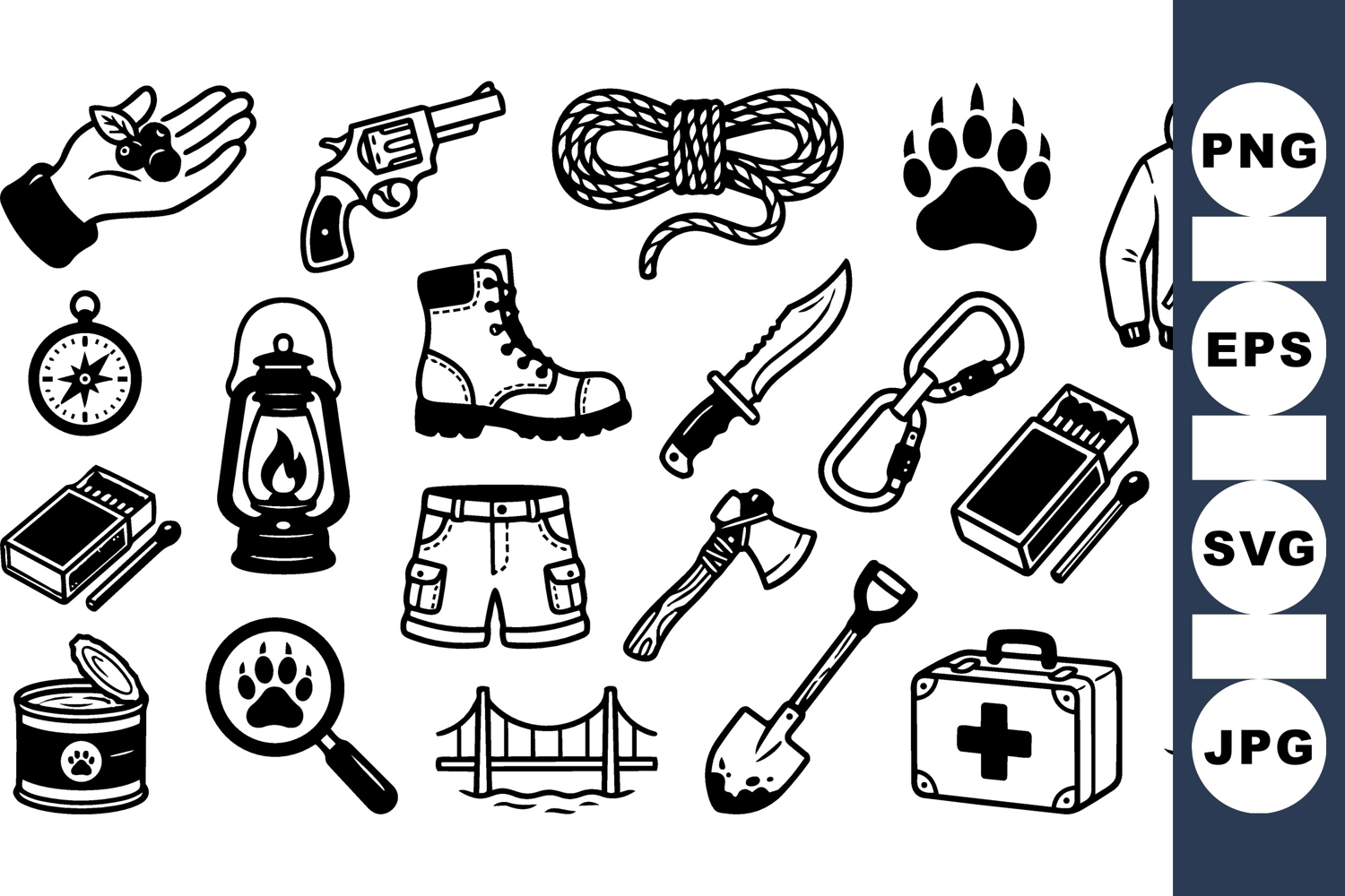 Outdoor Adventure Icons Hiking Gear Icons Camping Equipment Set Survival Tools Bundle Wilderness Exploration Pack Outdoor Hiking Icons Campfire And Lantern Set First Aid Kit Icons Animal Tracking Symbols Rope And Climbing Icons