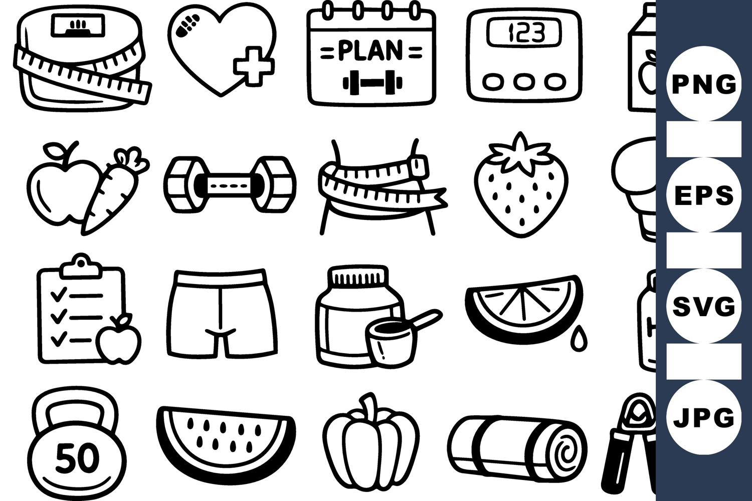 Hand drawn line art icons depict fitness and healthy eating items, used for apps, infographics, wellness branding, playful.