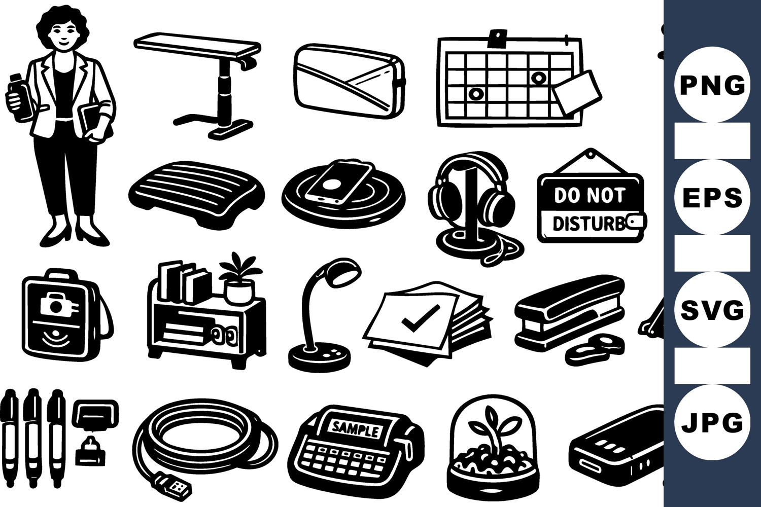 Black and white line art icons depict assorted office objects and a woman, useful for web icons branding and editorial, minimal.