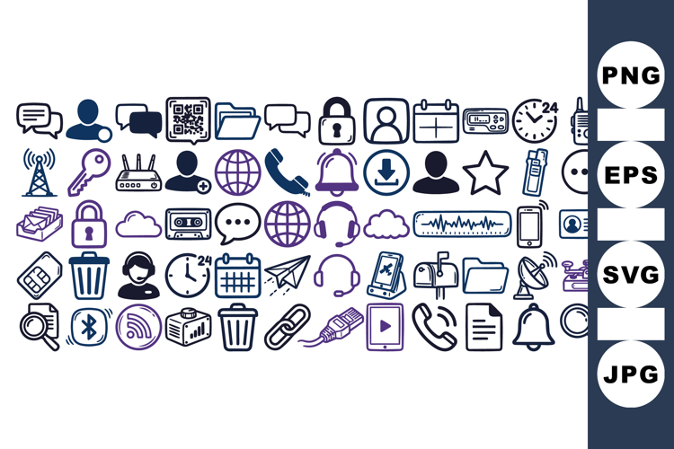 Hand drawn line art icons display communication and technology symbols in purple and navy tones for app ui, web, and branding, vibrant.