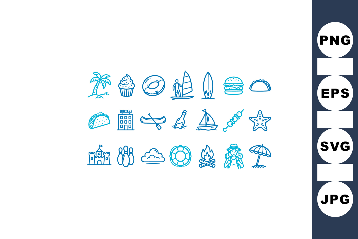 A whimsical doodle icon sheet shows blue beach and travel motifs for social media and apparel design, playful.