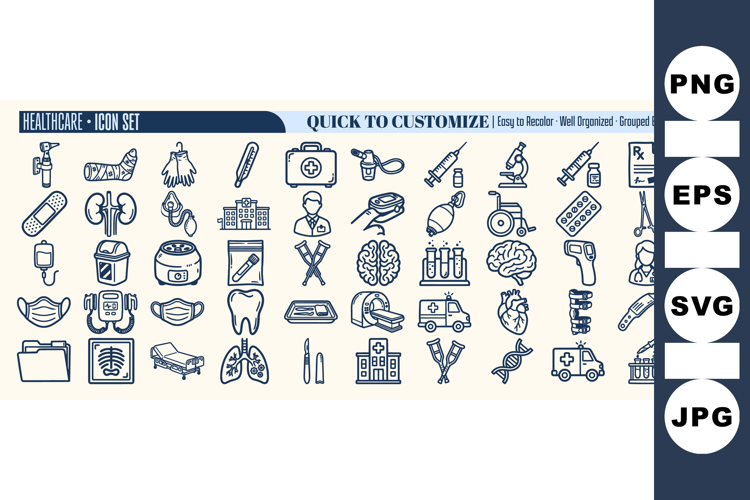 A line art medical icon set displays healthcare symbols in navy on beige background, used for apps, ui, and print, clean