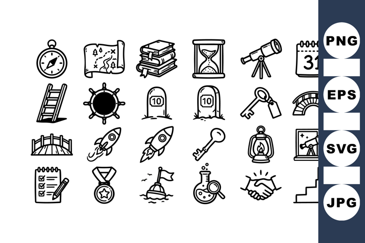 An organized vector icon grid combines hand drawn line symbols for navigation, science, achievement and planning in clean monochrome playful.