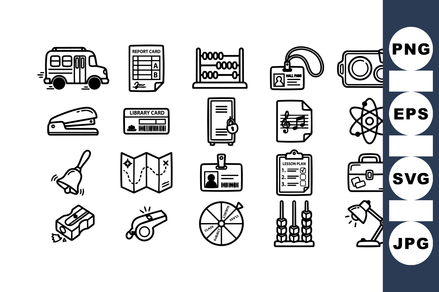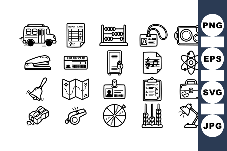 Education Icon Set Classroom Svg Bundle School Supplies Icons School Bus Icon Student Lesson Plan Office Stationery Icons Black Line Clipart Learning Vector Pack Study Material Graphics Educational Tool Kit