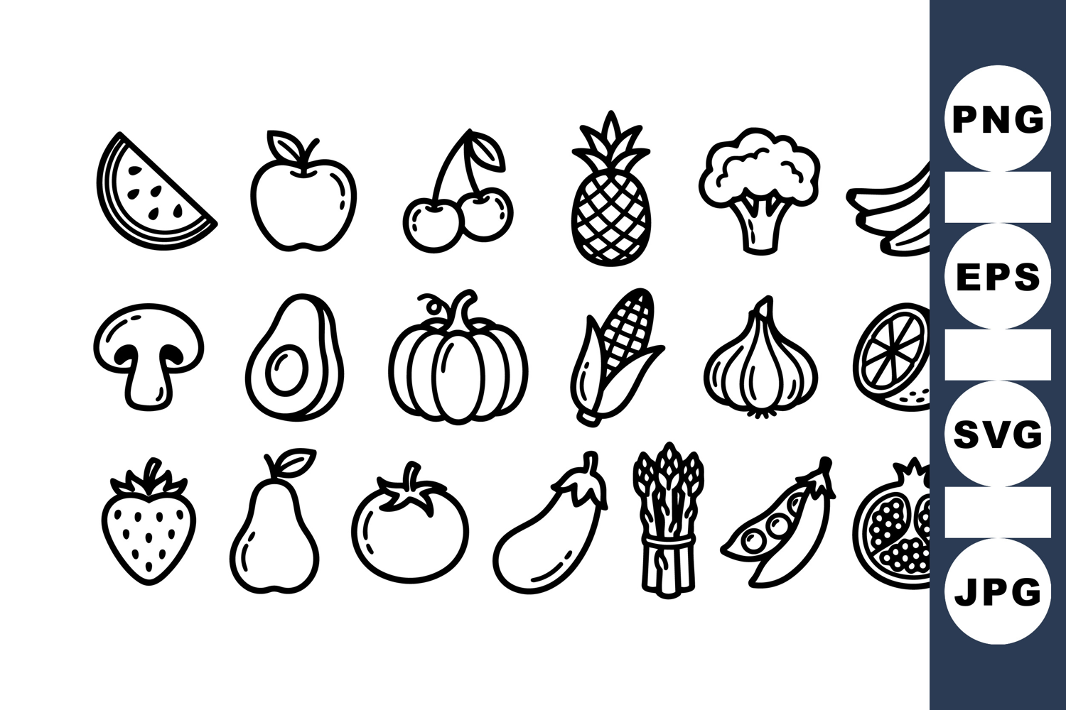 Playful hand drawn line art icons depict assorted fruits and vegetables, suited for packaging, stickers, menus, and healthy lifestyle branding, cheerful.