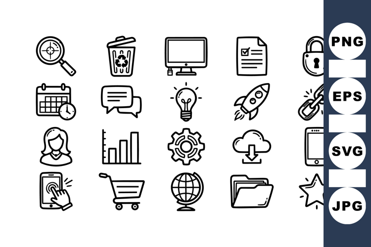 A hand drawn vector icon set displays business and tech symbols in simple black line art for web and print designs, crisp.