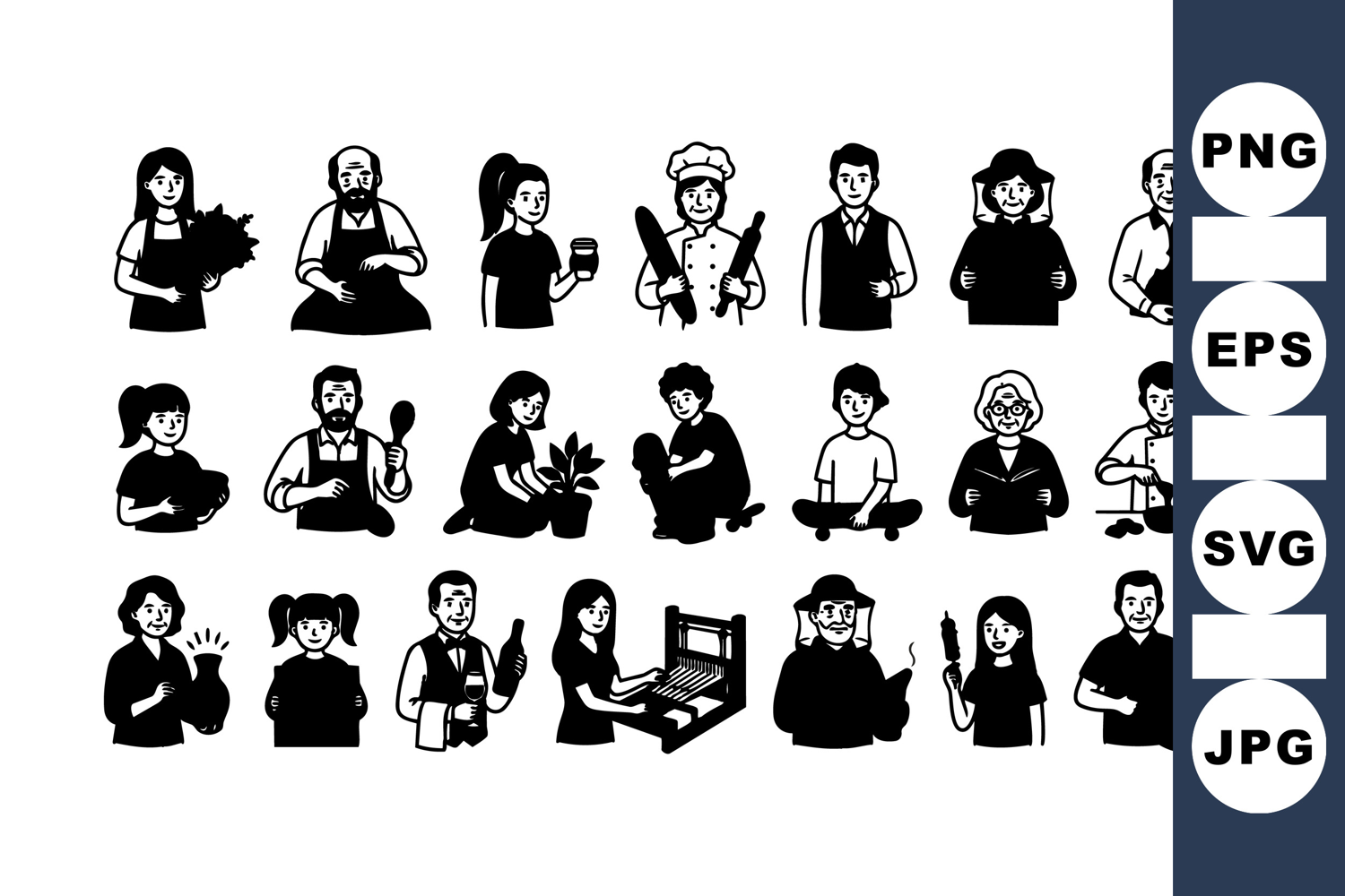 A monochrome flat silhouette icon set depicts smiling artisans and hobbyists doing cooking, gardening, music and crafting for editorial and ui use, playful