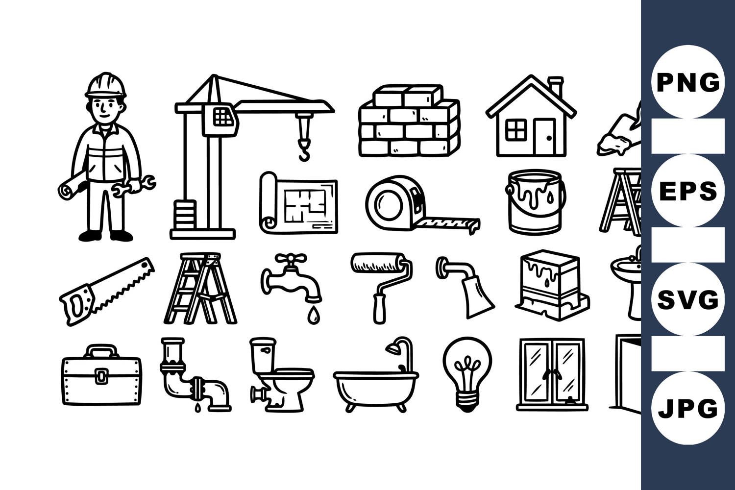 A hand drawn vector icon set depicts construction and plumbing tools for branding, web widgets, and print manuals with playful mood.