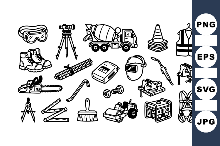 A line art vector set depicts construction equipment and safety gear for signage, manuals, and web icons, clean and practical.