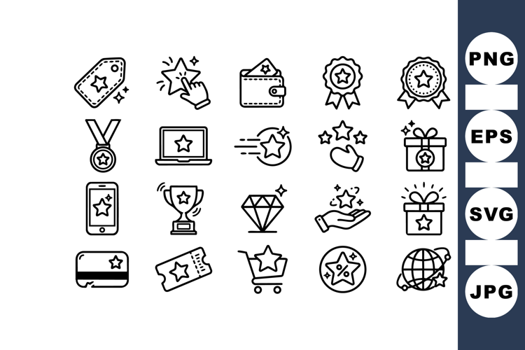 A minimalist line icon collection depicting stars, trophies, badges and gifts for ui, branding and print applications, crisp and versatile.
