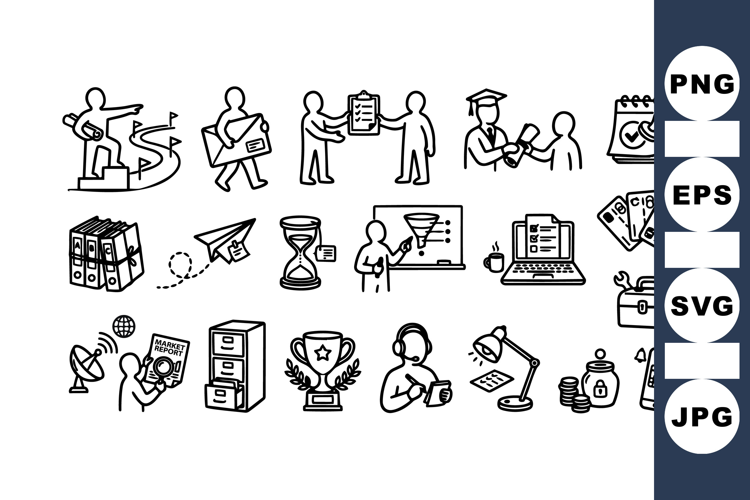 Hand drawn line art icons depict business tasks, office tools and awards for web, app and presentation graphics with playful energy.