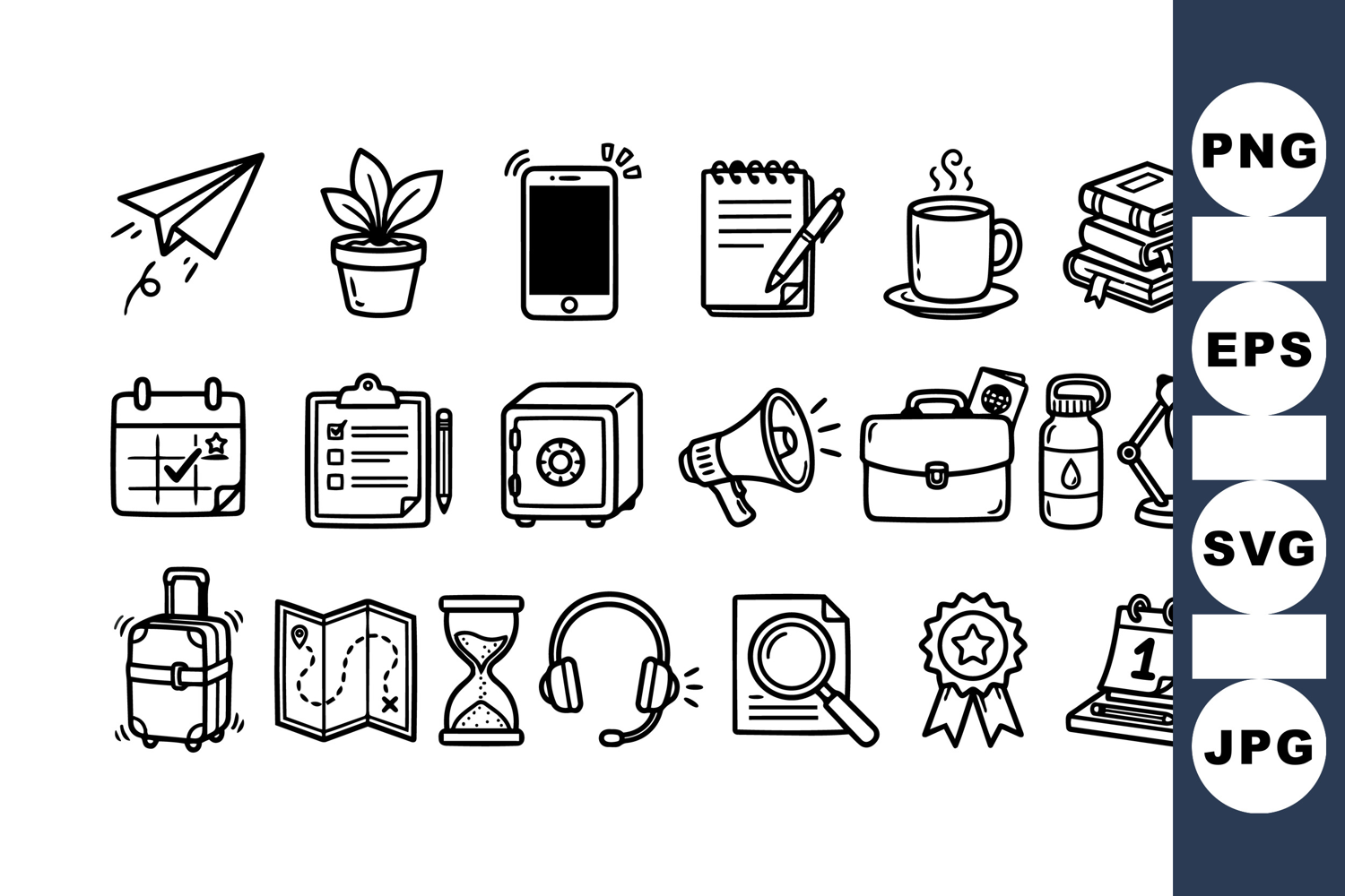 Hand Drawn Icons Office Supplies Clipart Vector Icon Collection Office Technology Icons Communication Vector Set Productivity Icon Bundle Business Planning Kit Business Office Set Workplace Vector Pack Travel And Time Icons