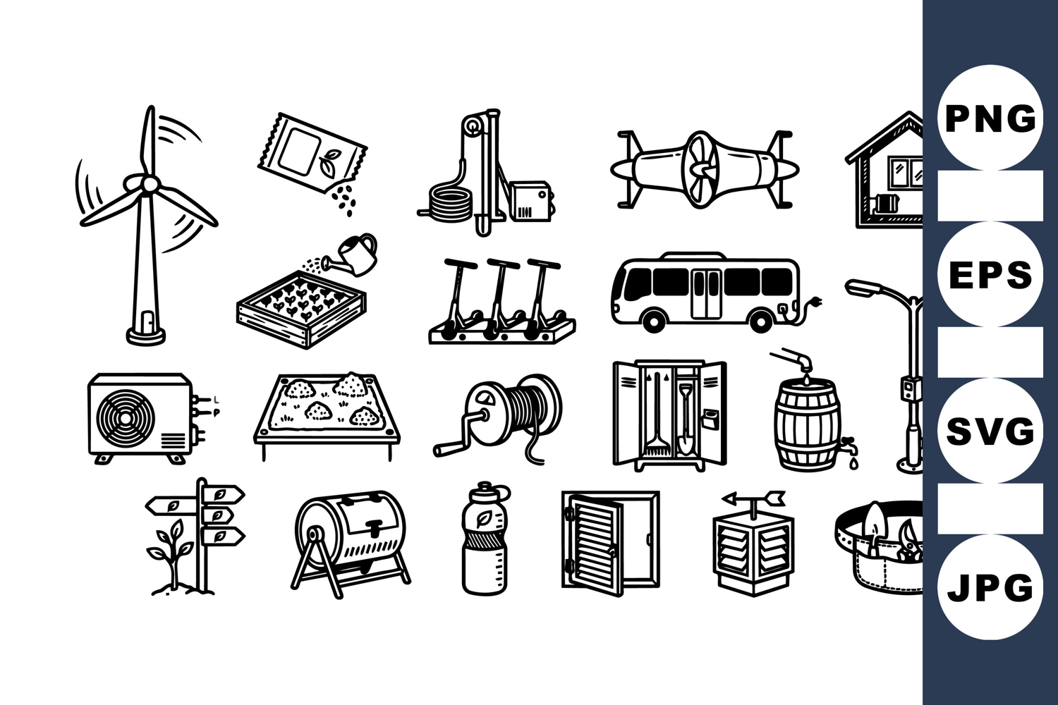 Renewable Energy Icons Green Energy Bundle Garden Tool Illustrations Urban Eco Symbols Electric Vehicle Graphics Sustainable Living Icons Water Conservation Clipart Home Gardening Elements Environment Friendly Design Composting And Recycling
