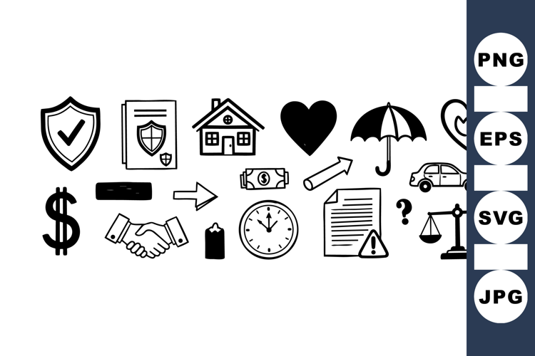 A collection of hand drawn line art icons representing insurance, finance, health, and legal concepts with simple black strokes on white background, minimalistic style.