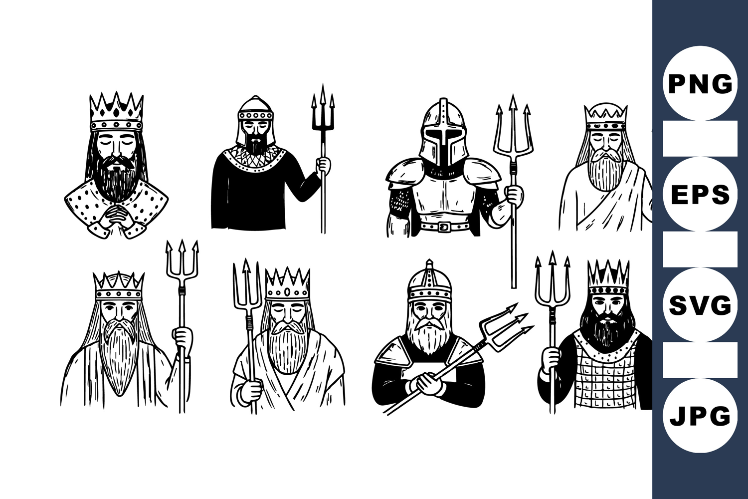 A collection of black and white line drawings showing medieval kings holding tridents and wearing different crowns and armor in detailed ink style.