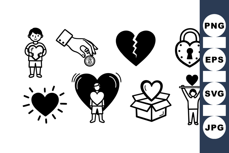 A minimalist black and white icon collection depicting hearts, broken heart, locked heart, and generosity with coin insertion, perfect for digital use and designs.
