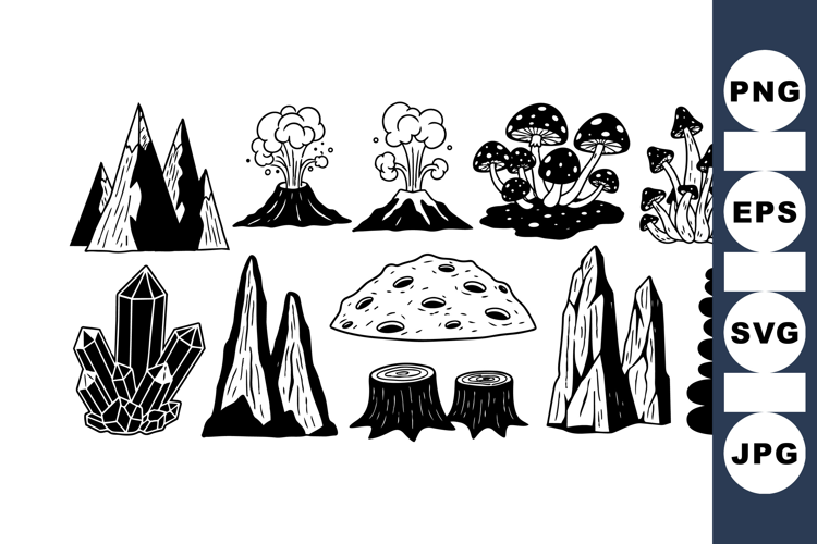 Black And White Clipart Hand Drawn Crystals Natural Rock Clipart Forest Nature Elements Volcano Lava Illustration Tree Stump Clipart Set Mushroom Vector Art Mountain Nature Illustration Crystal Vector Bundle Rock Clipart Collection