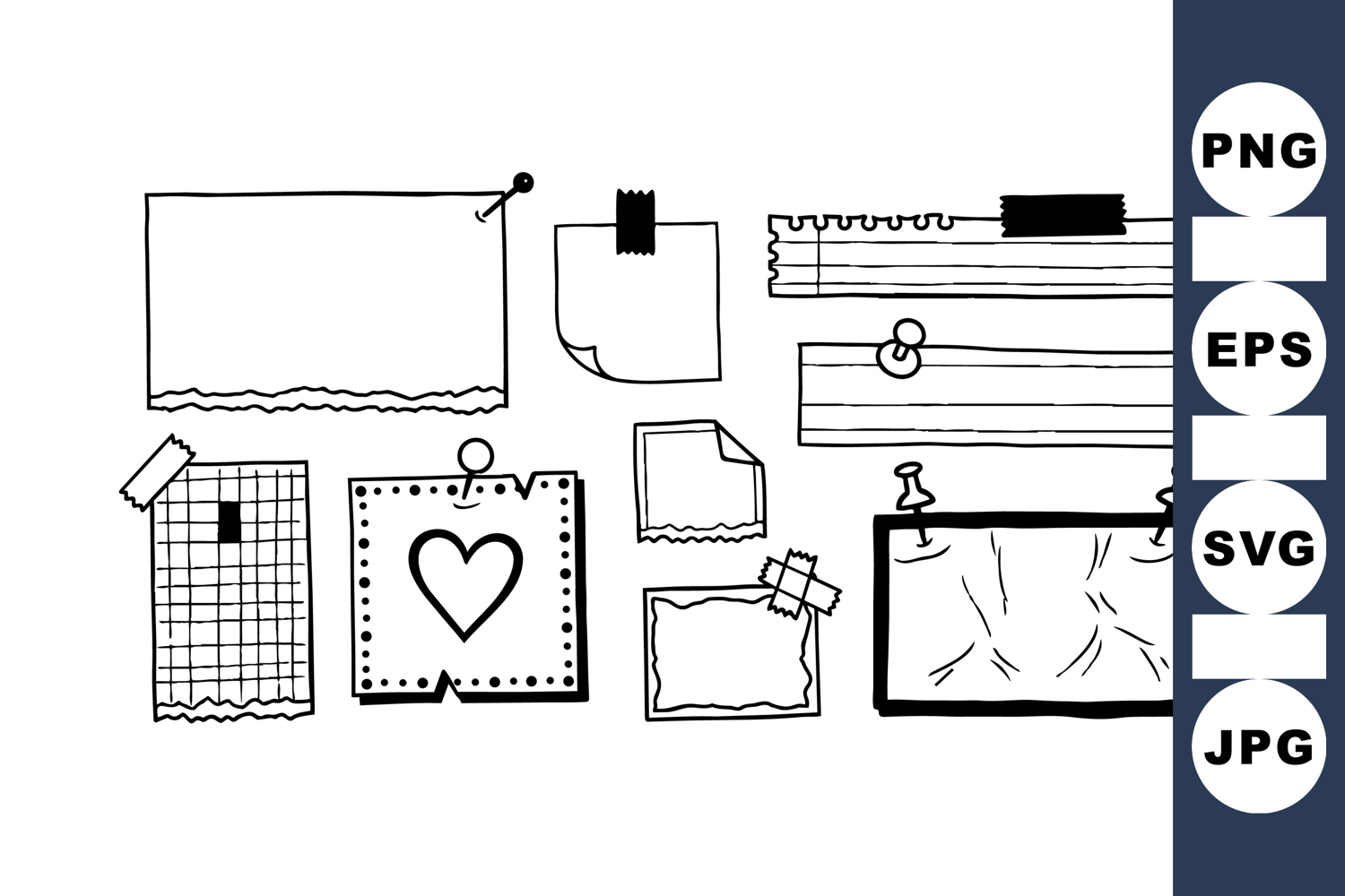 A whimsical collection of hand drawn papers and notes pinned with clips and pins, including a heart shape, displayed in black and white line art style, suitable for design projects and scrapbooking with playful mood.