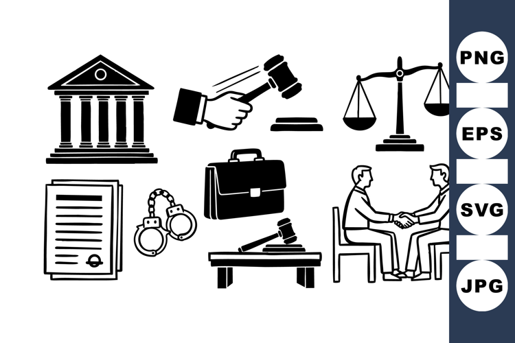 Black silhouette icons represent legal and justice concepts including a courthouse, gavel, scales, contract, handcuffs, briefcase and handshake for various law related uses