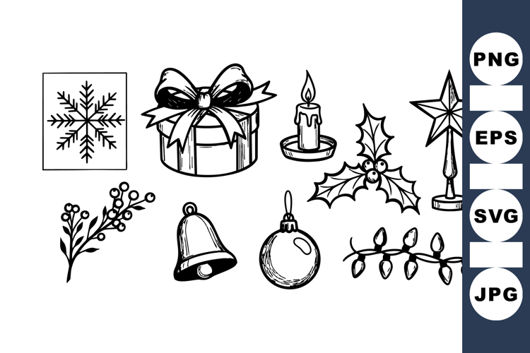 A collection of black and white christmas decoration sketches including a wrapped gift, holly leaves, bell, ornament, star topper, and candle in simple line art style, festive mood