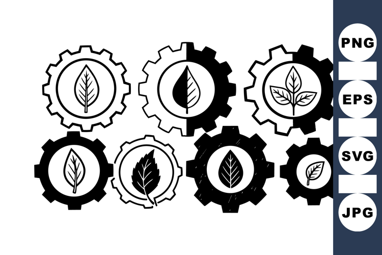 Monochrome flat design vector shows gears combined with leaf icons symbolizing agriculture, environment, and sustainability themes in simple visual style