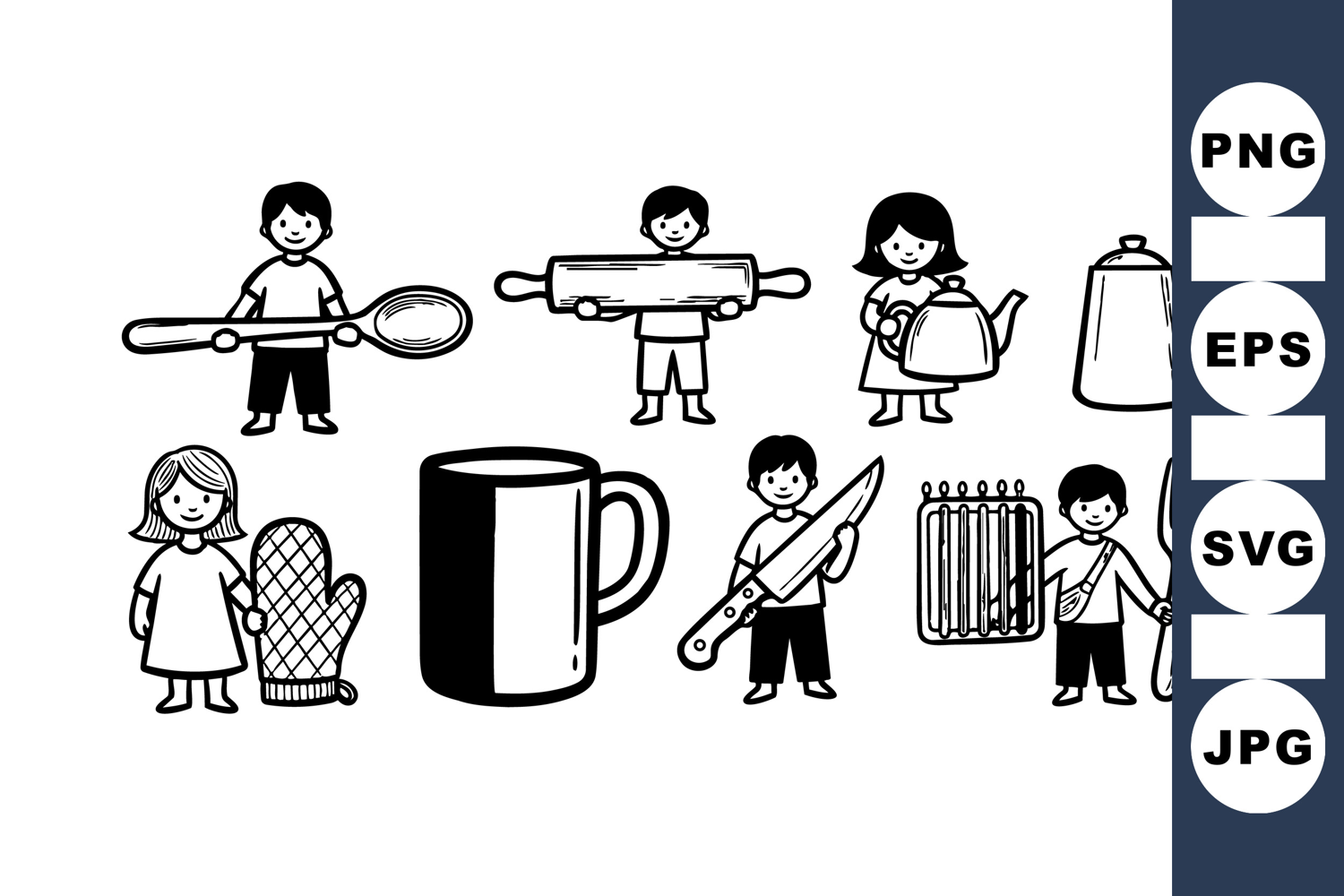 Cute black and white cartoon children holding oversized kitchen items including ladle, rolling pin, and fork in playful culinary theme with simple line art style