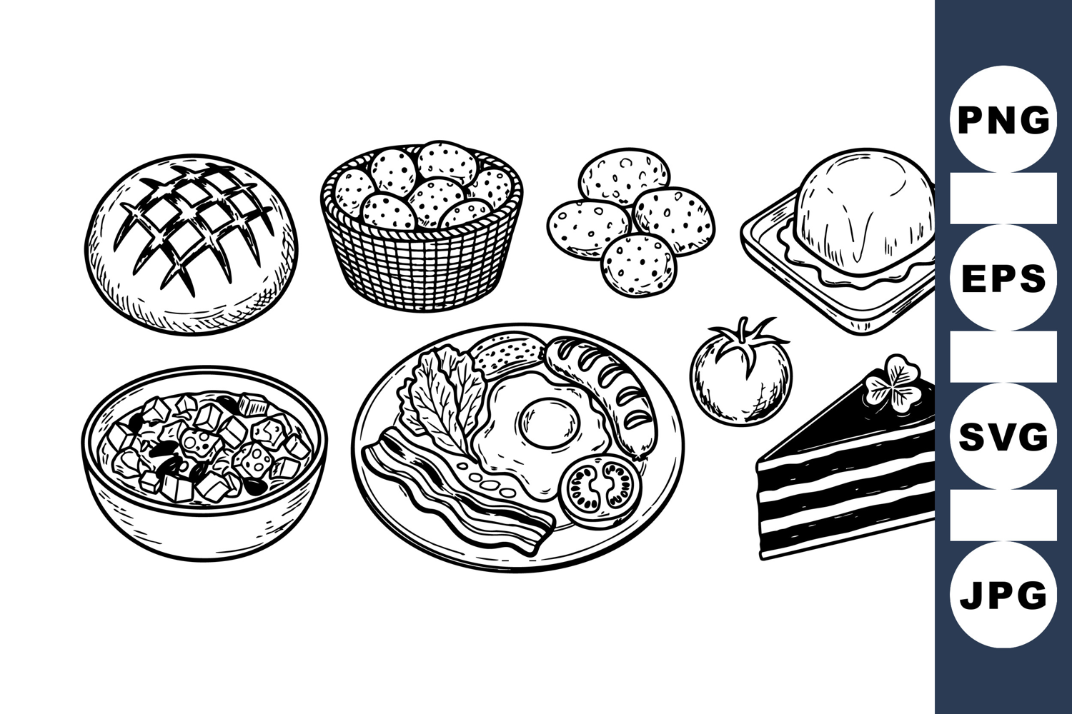 Black And White Clipart Hand Drawn Illustration Fried Egg Clipart Vintage Food Clipart Breakfast Meal Set Retro Breakfast Art Food Platter Bundle Dessert Slice Clipart Breakfast Basket Design Cake Slice Illustration