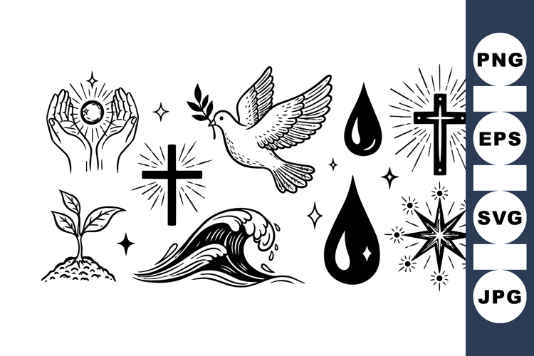Water Wave Clipart Holy Cross Clipart Nature Inspired Icons Peace Dove Graphic Hand Drawn Symbols Spiritual Icon Clipart Religious Symbol Bundle Minimalist Blackwork Design Divine Illustration Set Celestial Star Graphics