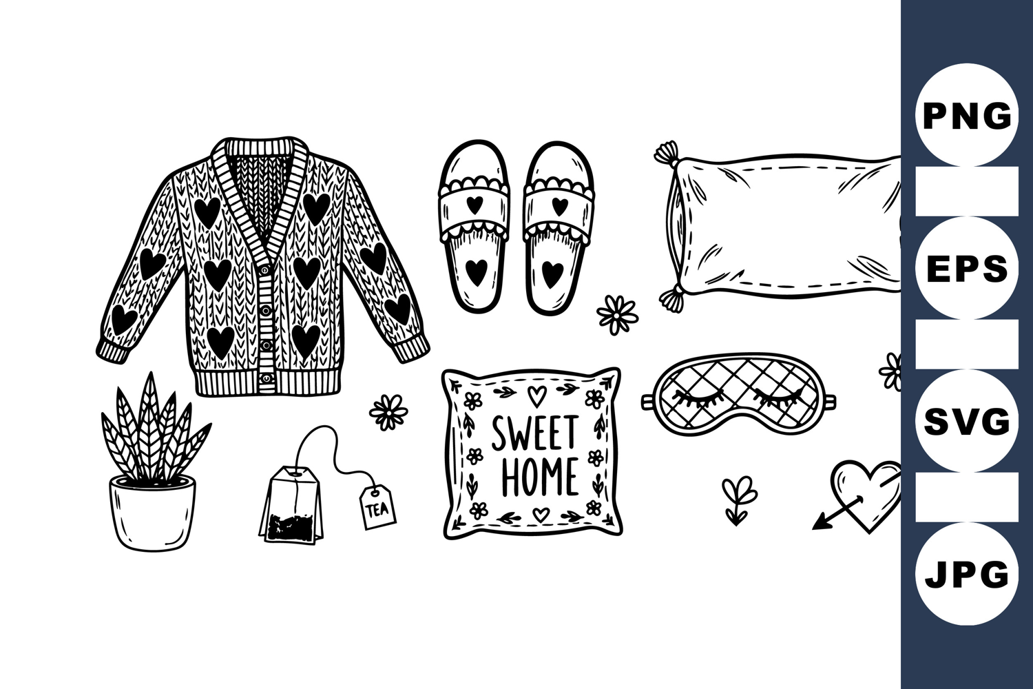 Hand drawn black and white line art features cozy home essentials including a sweater, slippers, pillows, tea bag, eye mask, and decorative hearts, peaceful and charming.