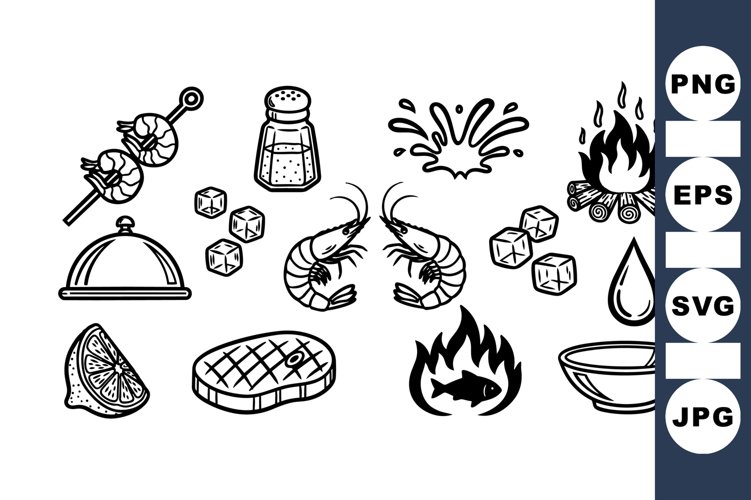 A black and white line art set illustrating cooking related icons such as grilled steak, shrimp, fire, lemon wedge, salt shaker, and sauce splash in minimal style.