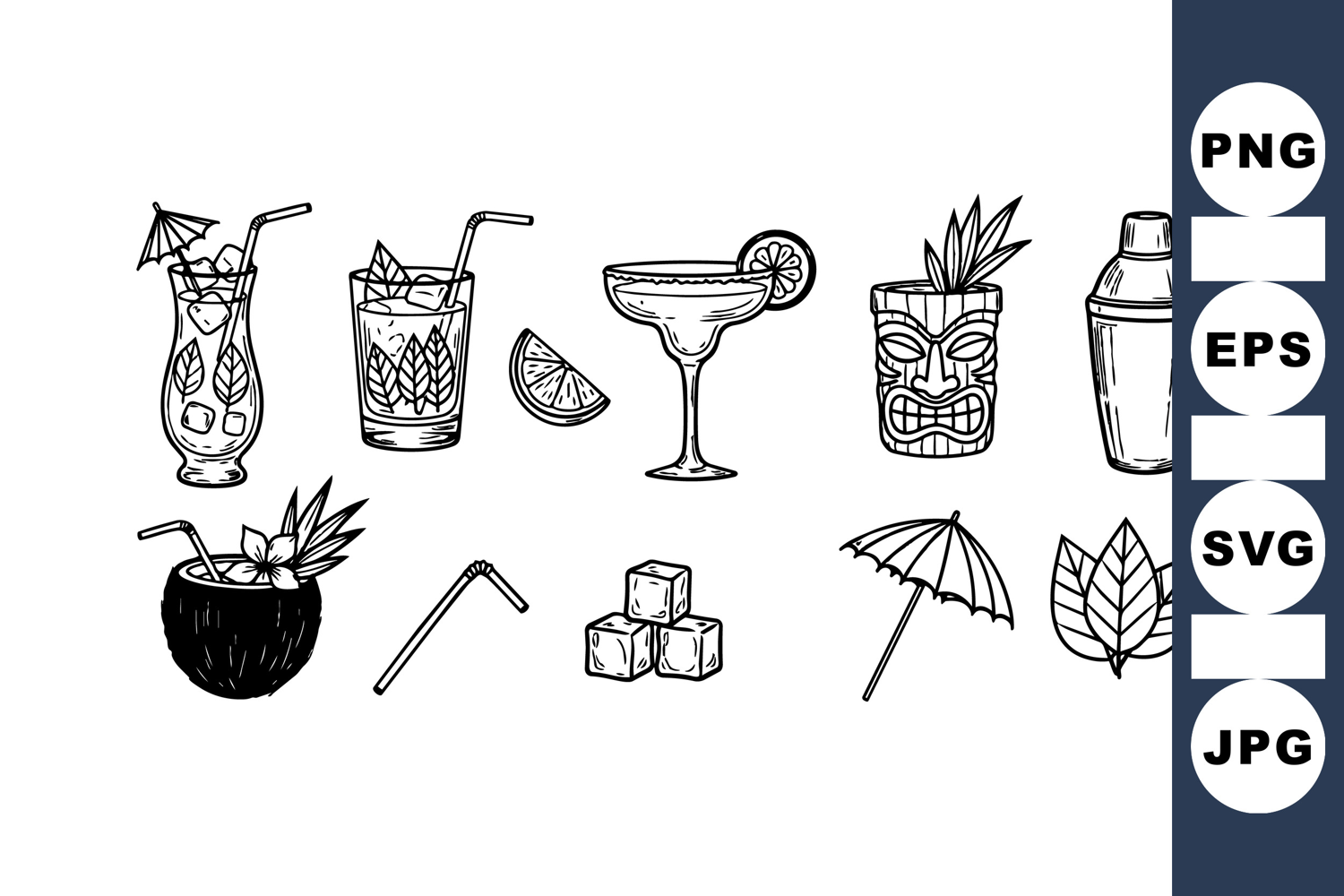 A black and white line art set illustrating various tiki cocktails with glasses, shaker, ice cubes, straw, umbrella, and mint leaves in clean style.