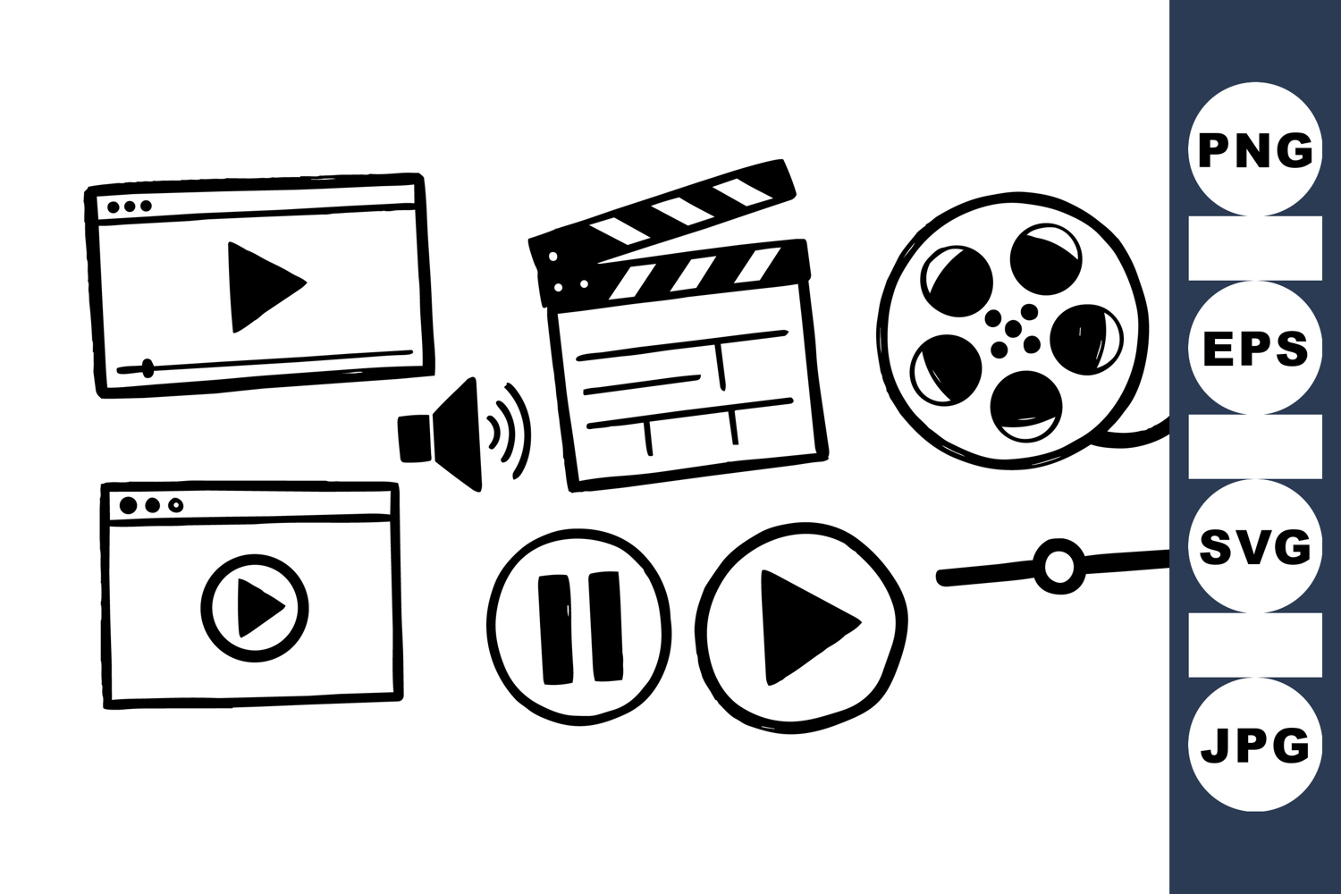 A hand drawn icon set shows play, pause, film reel, clapper board and volume controls for web, app and editorial use, playful.
