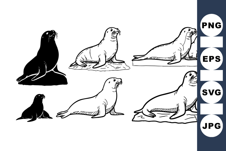 Minimalist black and white line drawings depict sea lions in profile and front views with clear outlines, suitable for educational or illustrative purposes, clean and simple.
