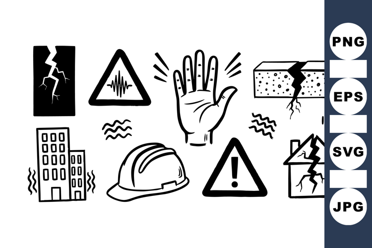 Safety Helmet Icon Warning Sign Bundle Emergency Alert Symbols Earthquake Safety Icon Disaster Preparedness Set Seismic Hazard Graphics Quake Damage Illustrations Earthquake Risk Pack Building Damage Clipart Emergency Hand Signal