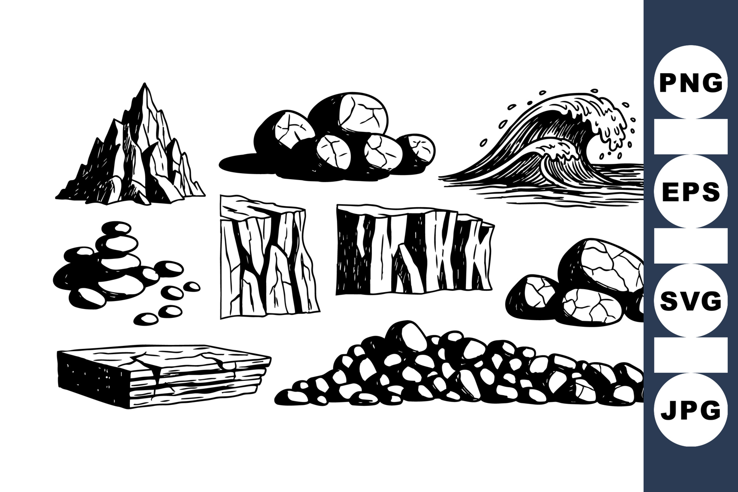 Detailed monochrome illustration of various rocky landscape elements including cliffs, waves, pebbles, and stacked stones in a hand drawn style suitable for natural or geological designs.