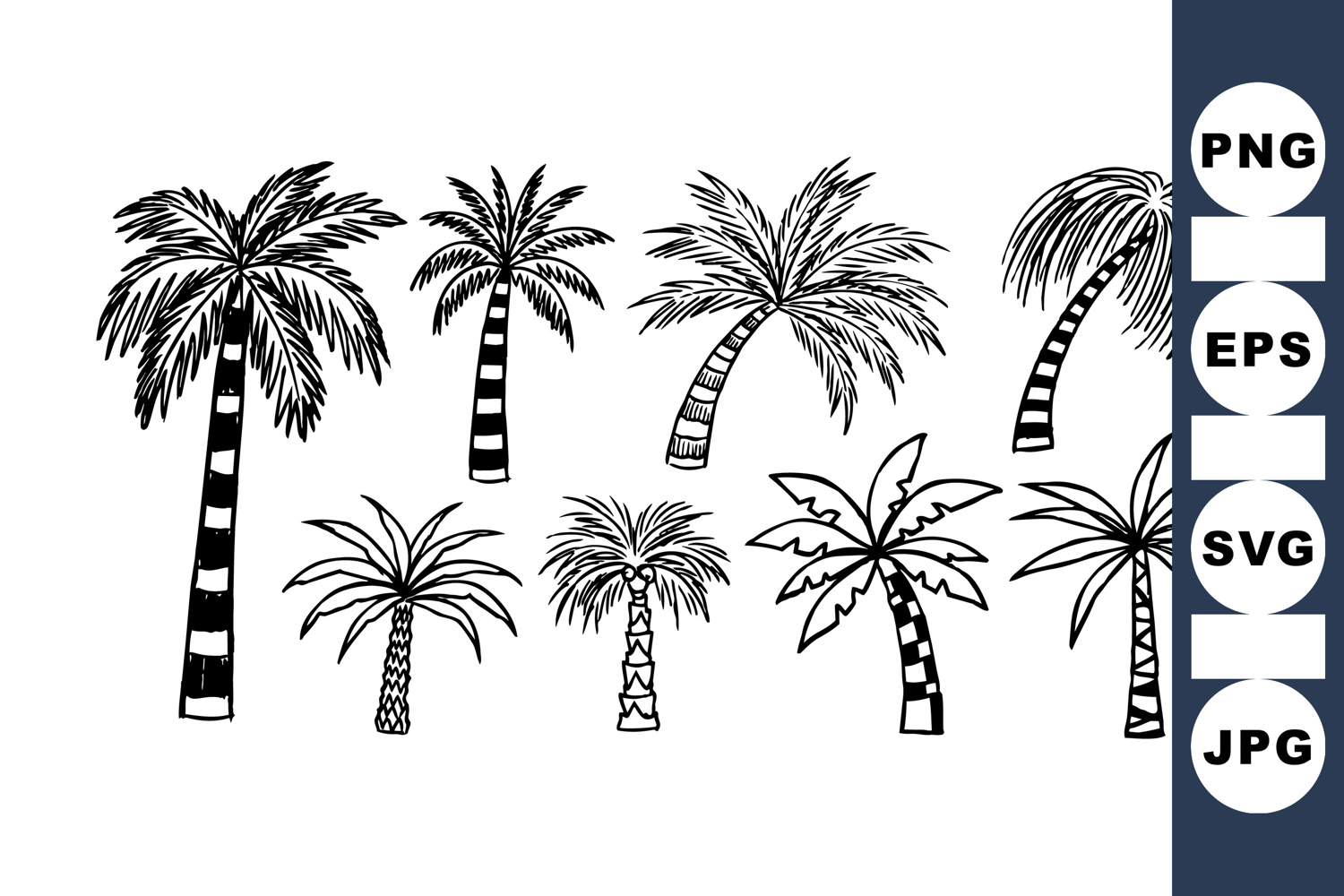 Collection of black and white hand drawn palm trees with distinct trunk patterns and leaf shapes in vintage botanical sketch style, suitable for design work.